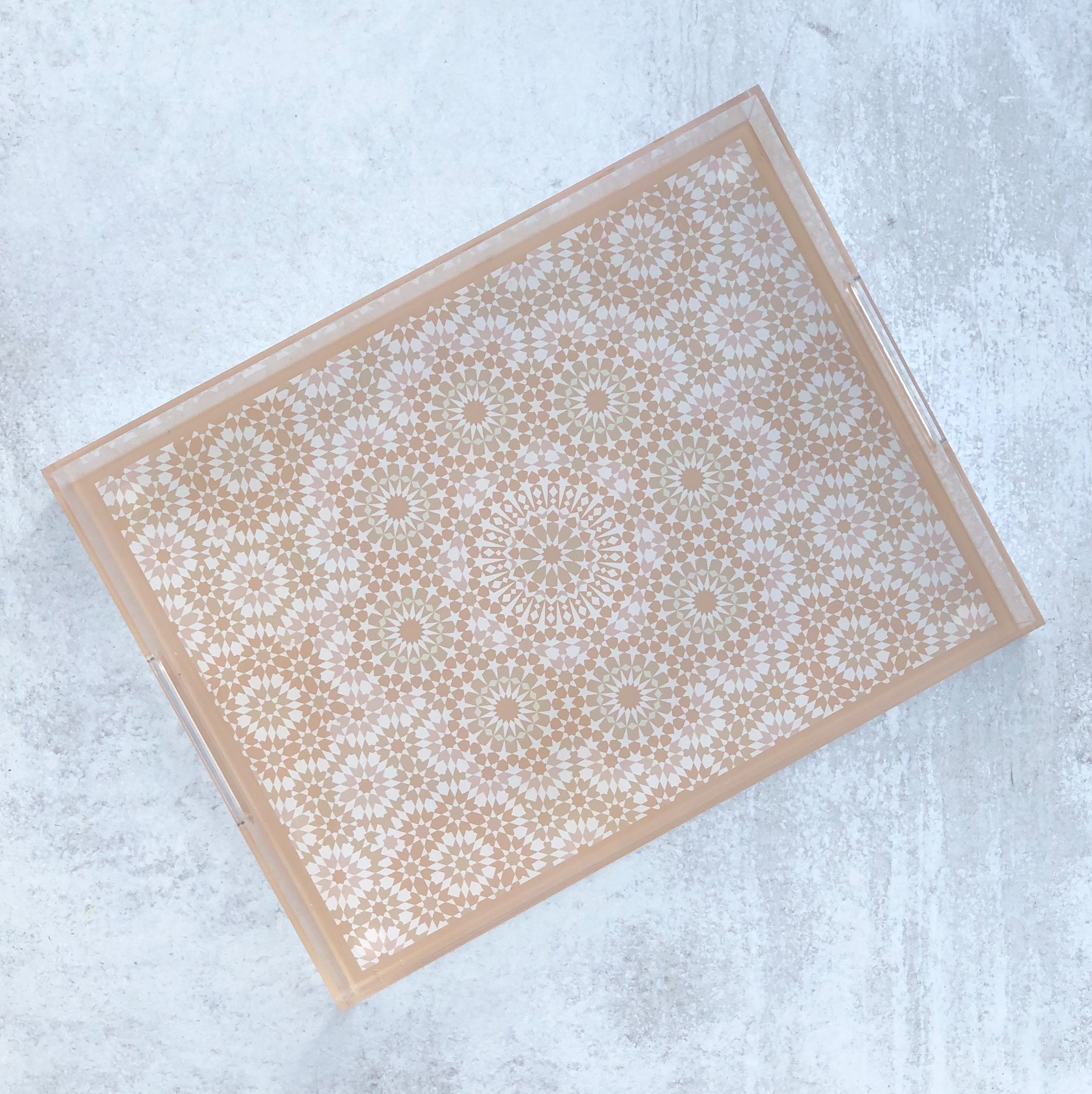 These Acrylic Trays are made of high-gauge acrylic so they're equal parts sturdy and stylish. This Tray comes in 3 color patterns: Blue, Pink & Gray, and Neutral.  A Marrakech mosaic design is printed on the bottom making this piece both a modern household tray and Islamic artwork in one.