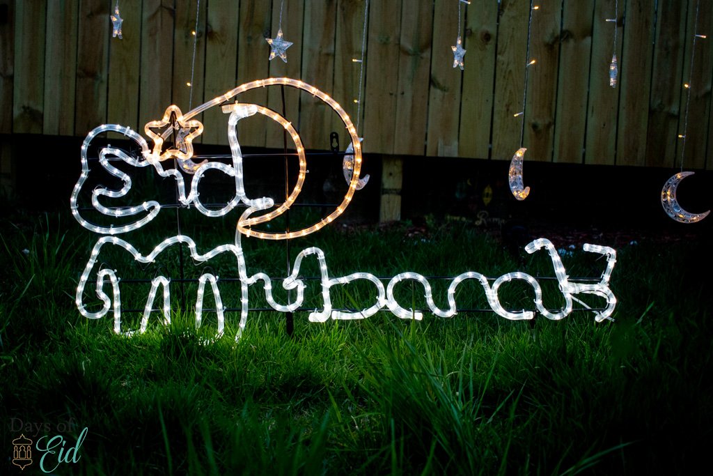 This metal frame sign contains the phrase "Eid Mubarak" in bright white LED rope light along with a crescent moon and star in bright yellow LED rope light. Comes with stand apparatus that allows you to set it up on your front yard securely and can also be hung up in your window or on your balcony using your own hooks. Emits light and is highly visible in daytime and gives off an elegant look at nighttime as well.