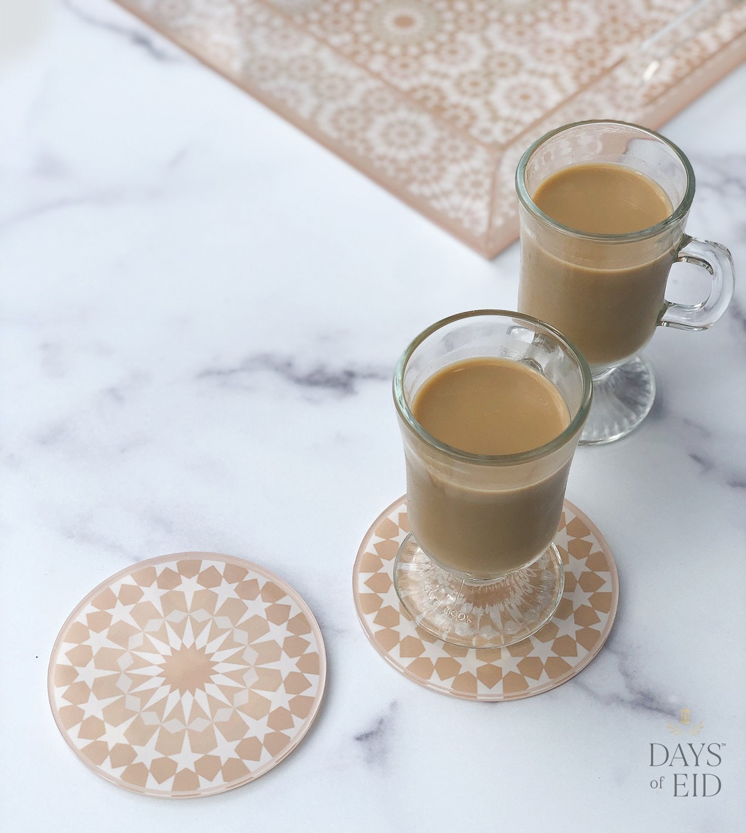 These Acrylic Coasters  are made of high-gauge acrylic so they're equal parts sturdy and stylish, just like our Marrakech Acrylic Trays. These coasters comes in 3 color patterns: Blue, Pink & Gray, and Neutral.  A Marrakech mosaic design is printed on the bottom making this piece both a modern household item and Islamic artwork in one. These coasters have non-slip material on bottom to prevent from slipping out of place.