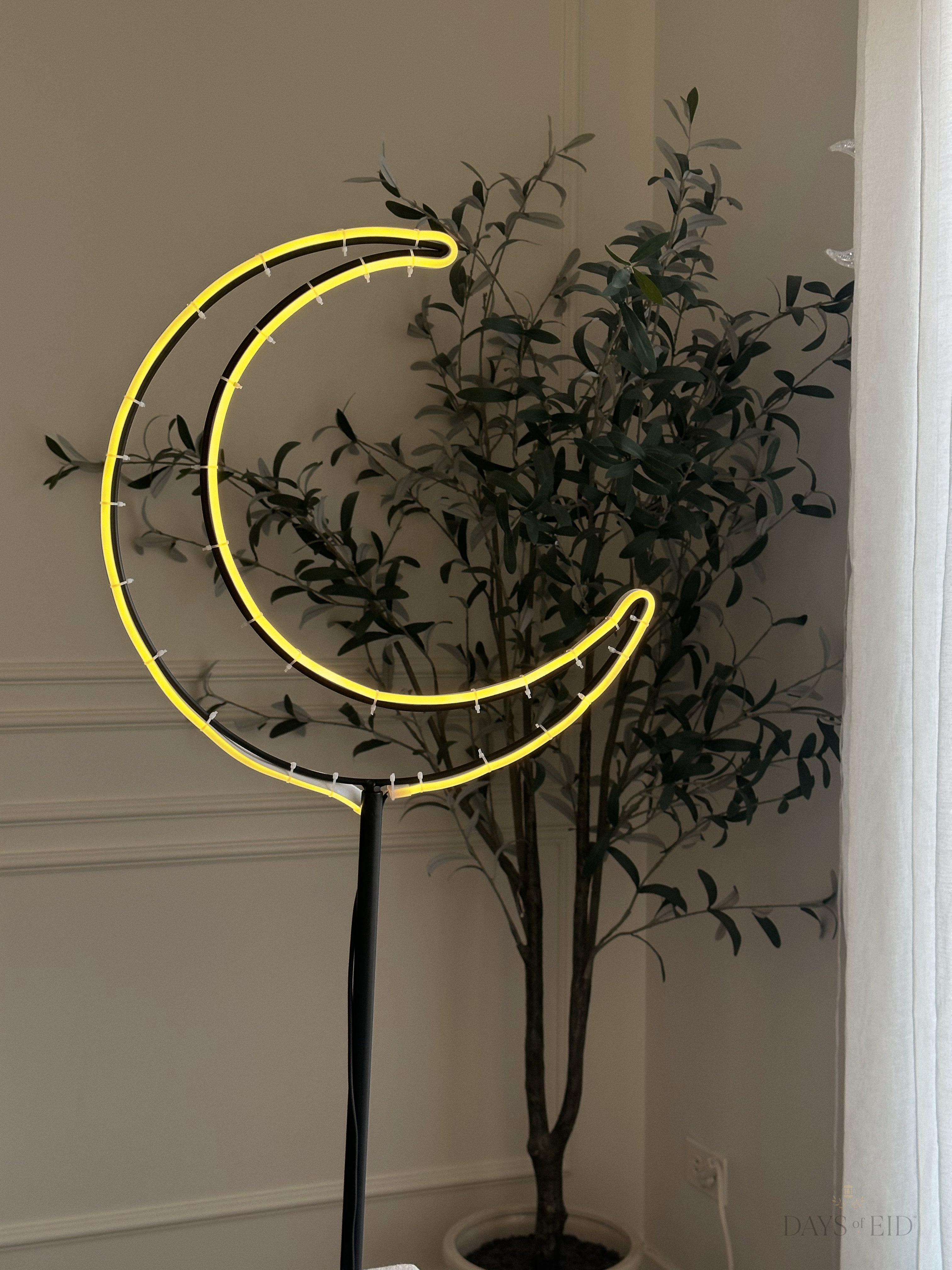 Enhance your space with our versatile Ramadan Crescent Moon Neon LED light. Featuring an adjustable black metal stand, you can place it anywhere in your home at your preferred height. Control the ambiance by choosing one of the 8 colors and light settings or dimming it for the perfect glow.