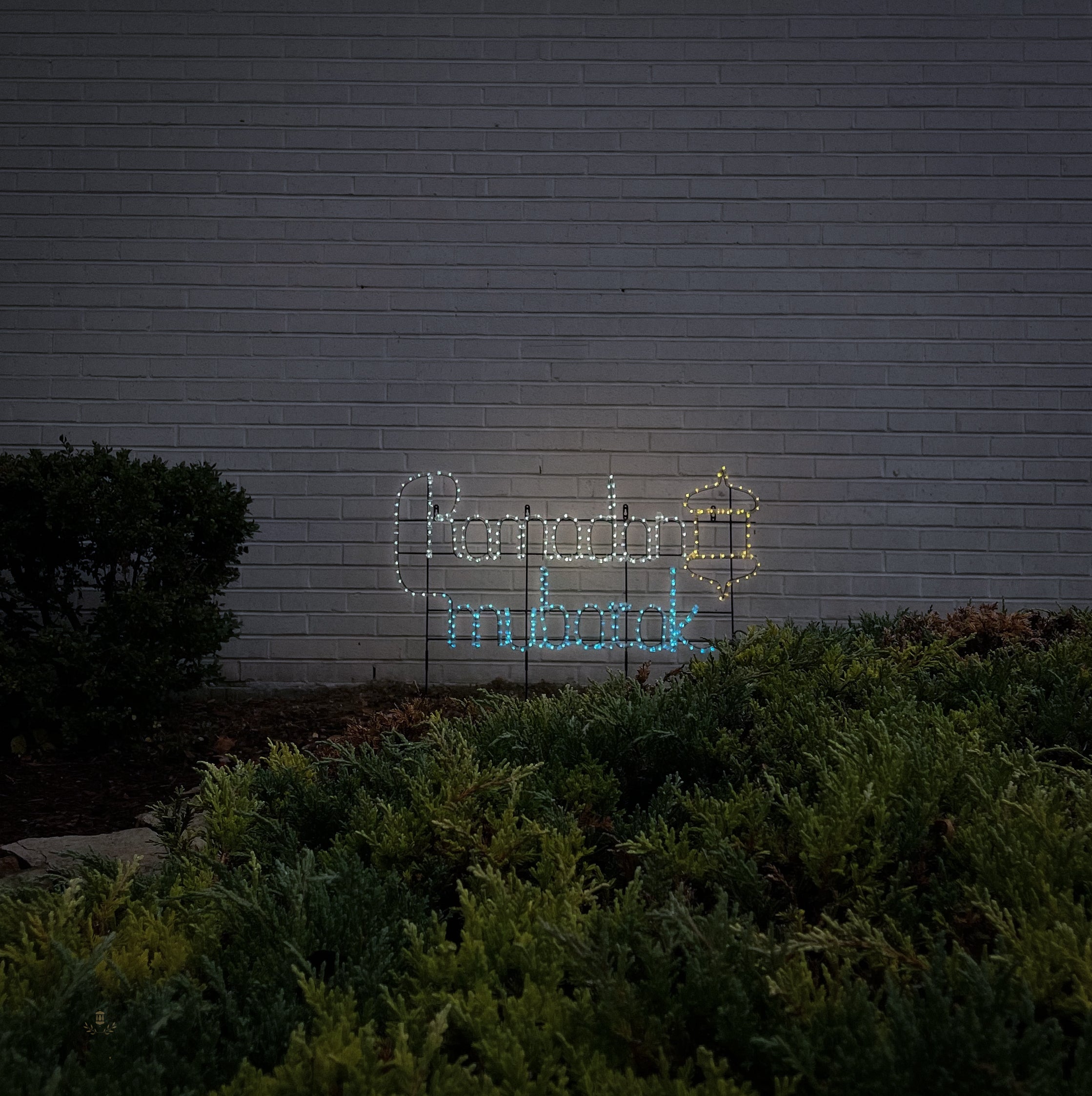 We've redesigned our original Ramadan LED Sign! This NEW metal frame sign contains the phrase "Ramadan Mubarak" in blue and white LED lights. It also features a yellow Moroccan style lantern. It can be hung up on hooks but also comes with stand apparatus that allows you to set it up on your front yard securely. Indoor Stands are sold separately. Emits light and is highly visible in daytime and gives off an elegant look at nighttime as well.