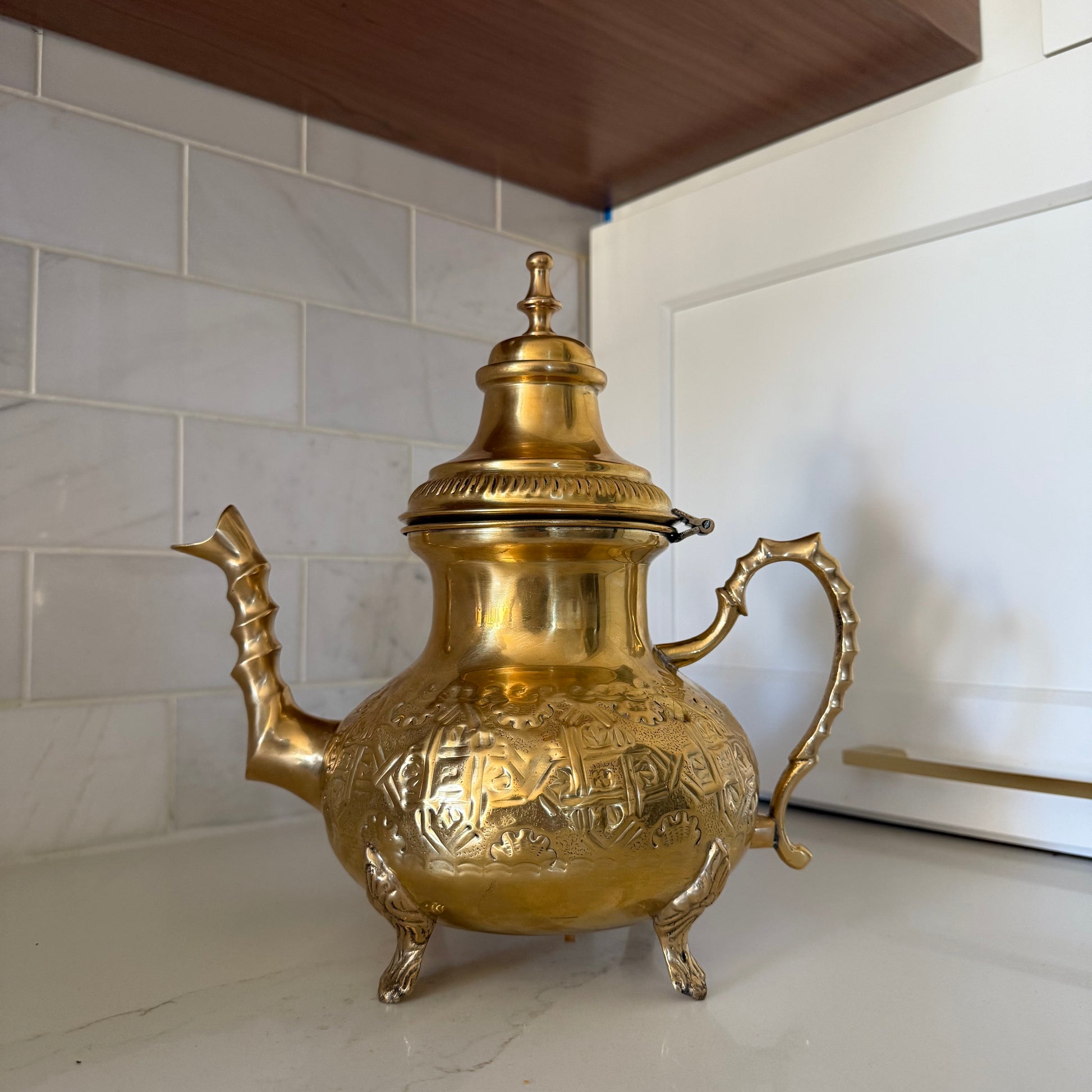 Bring a warm, old-world glow to your kitchen or coffee table with this Moroccan brass tea pot, finished in a rich gold tone and detailed with intricate engraved patterns. With its classic rounded body, tall domed lid, sculptural handle, and tripod feet, it’s a statement piece that looks beautiful on open shelving, trays, and bar carts—while still being perfectly suited for serving tea at gatherings.