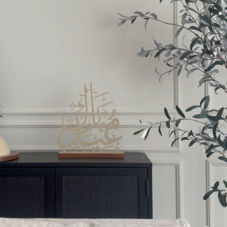 Crafted from durable metal and real acacia wood, this stand reads Eid Mubarak in Arabic.