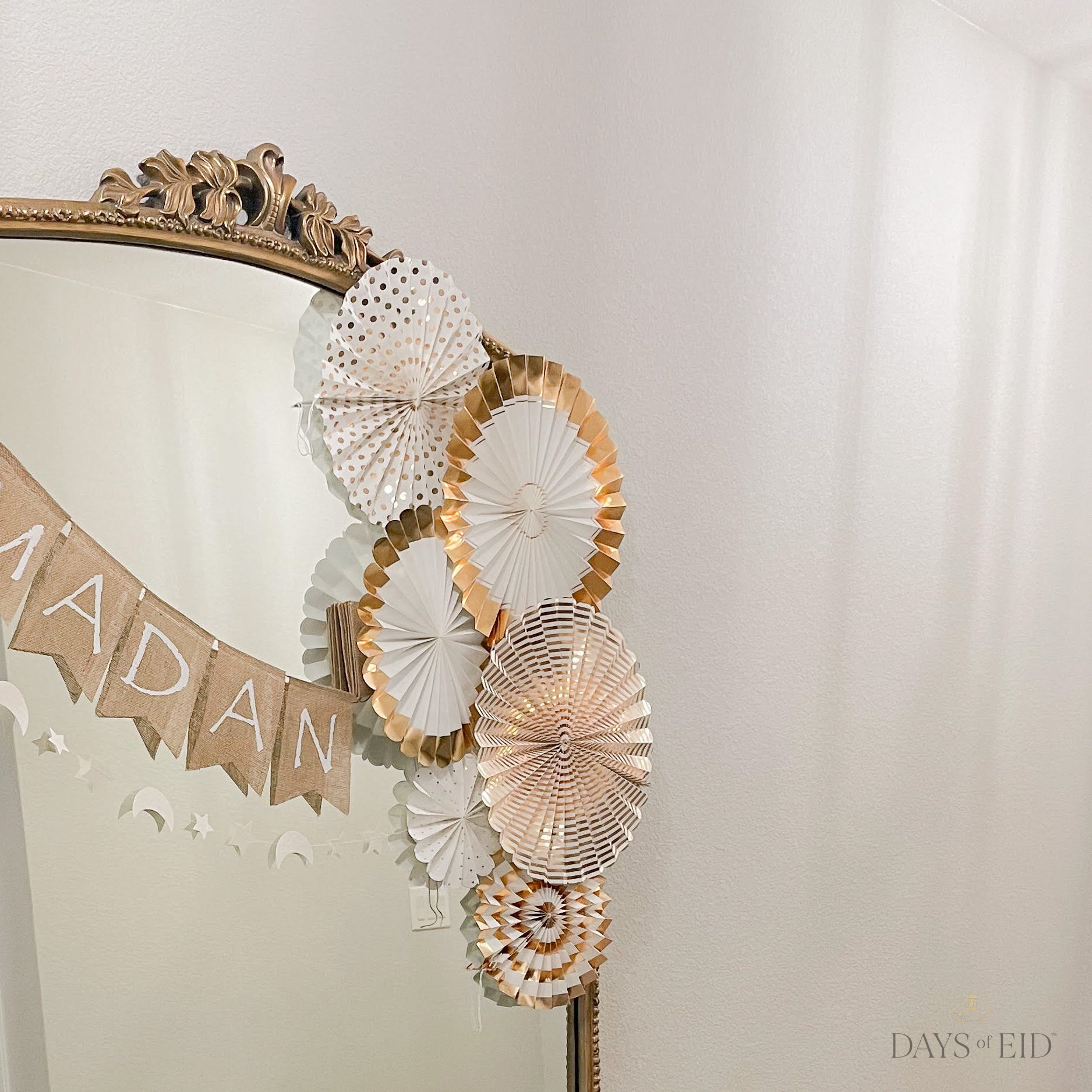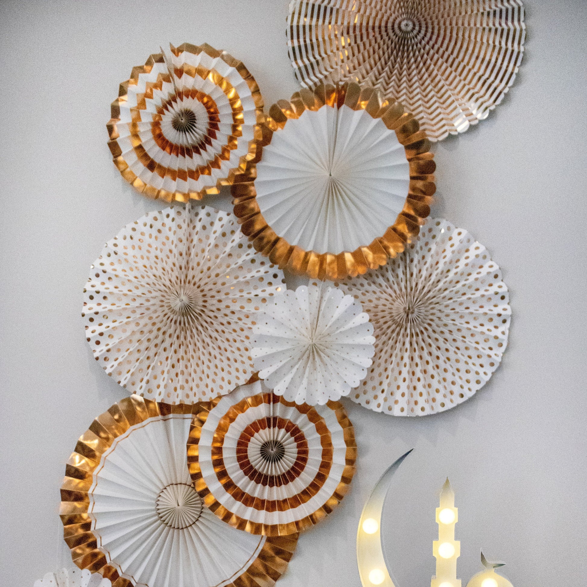 The Days of Eid™ Garland pack is a collection of décor including a bronze & crème color paper fan set, gold & crème color tassel garland, and two white glitter moon & star garlands. All of these décor items match our burlap banners perfectly and can even be used for other holidays. Use this set as a background for our Burlap banners to set the scene around your fireplace or decorate a pretty dessert table for your guests.