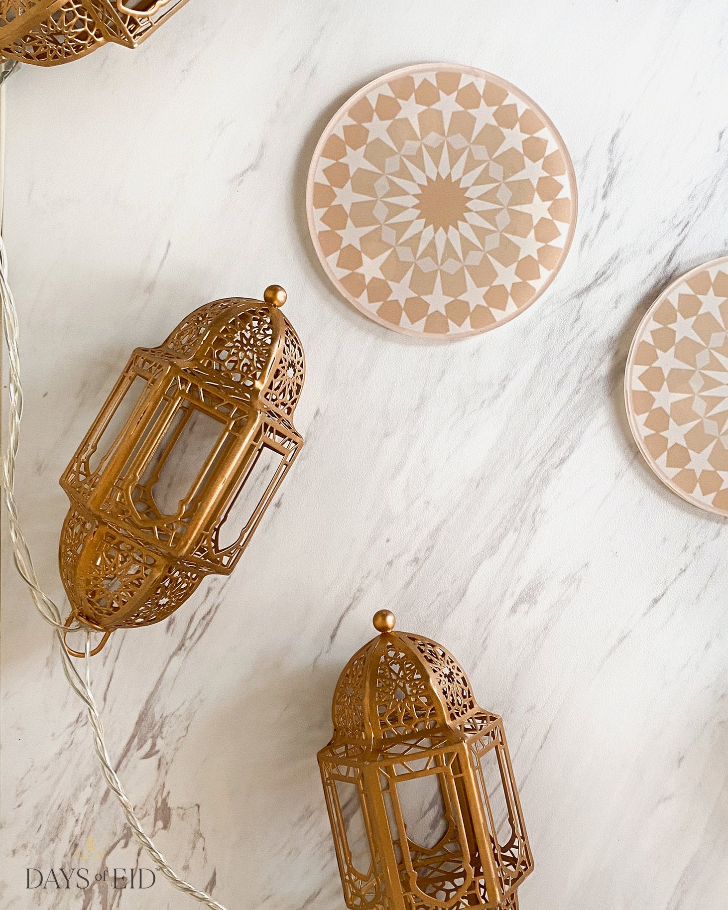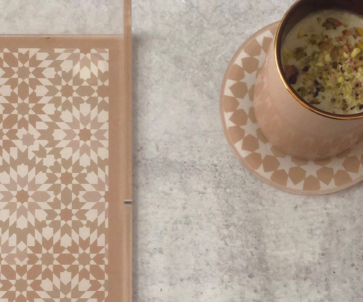 These Acrylic Coasters are made of high-gauge acrylic so they're equal parts sturdy and stylish, just like our Marrakech Acrylic Trays. These coasters comes in 3 color patterns: Blue, Pink & Gray, and Neutral. A Marrakech mosaic design is printed on the bottom making this piece both a modern household item and Islamic artwork in one. These coasters have non-slip material on bottom to prevent from slipping out of place.