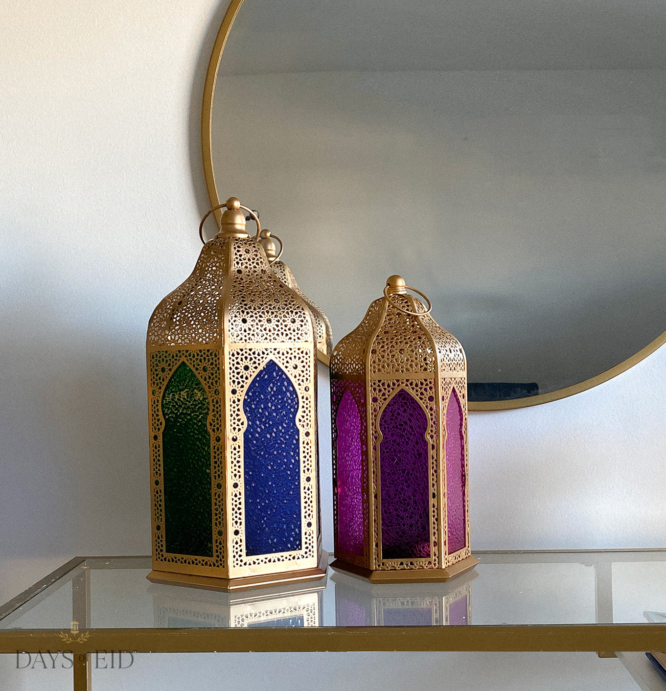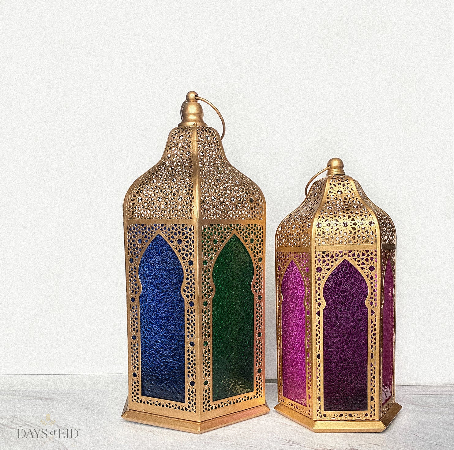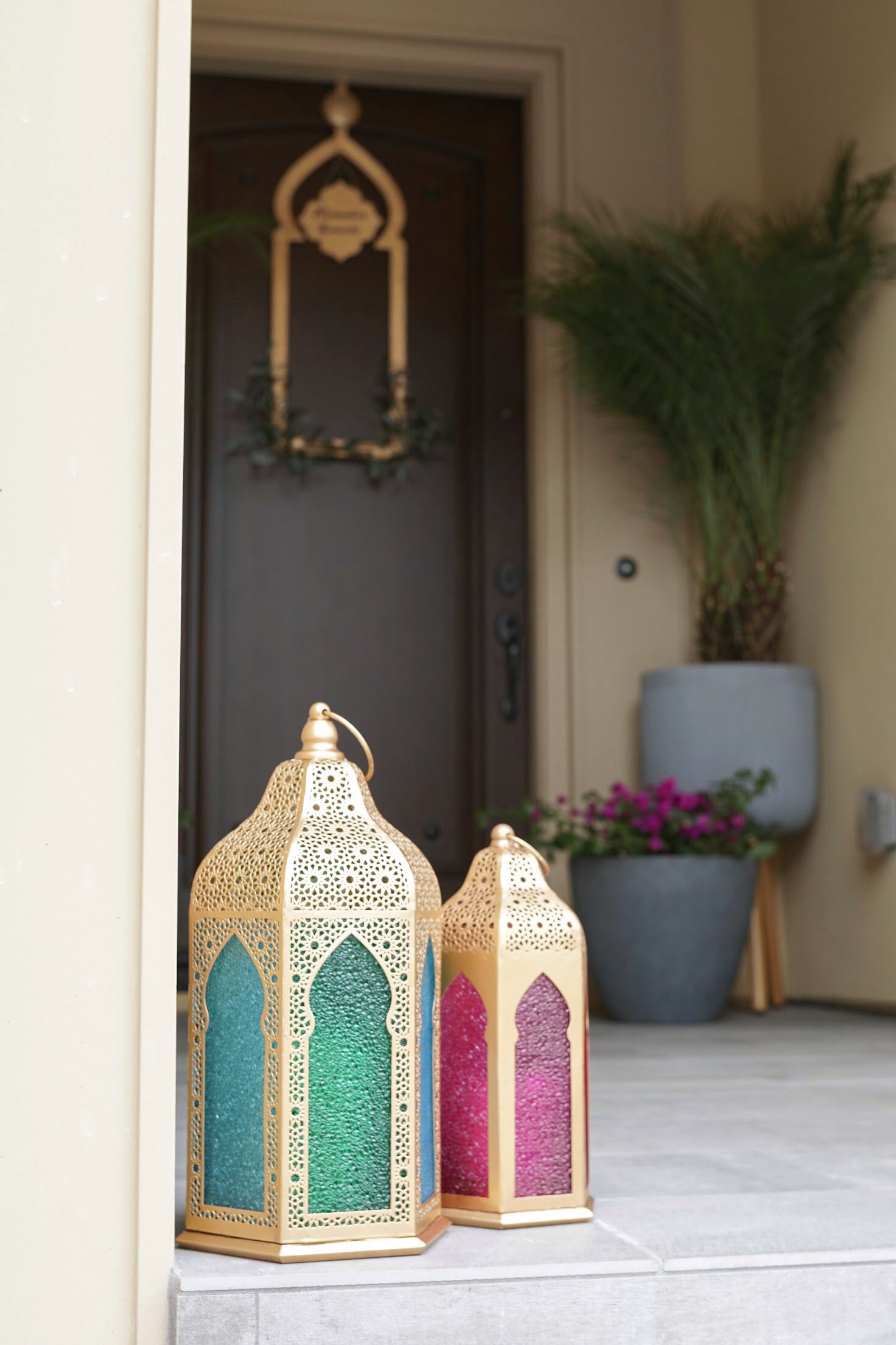 This Moroccan Floor Lantern Set is the perfect compliment to our Door Decor. The set includes one large lantern (17 in.) and one small lantern (13 in.). The metal detail incorporates traditional Islamic geometric art elements.