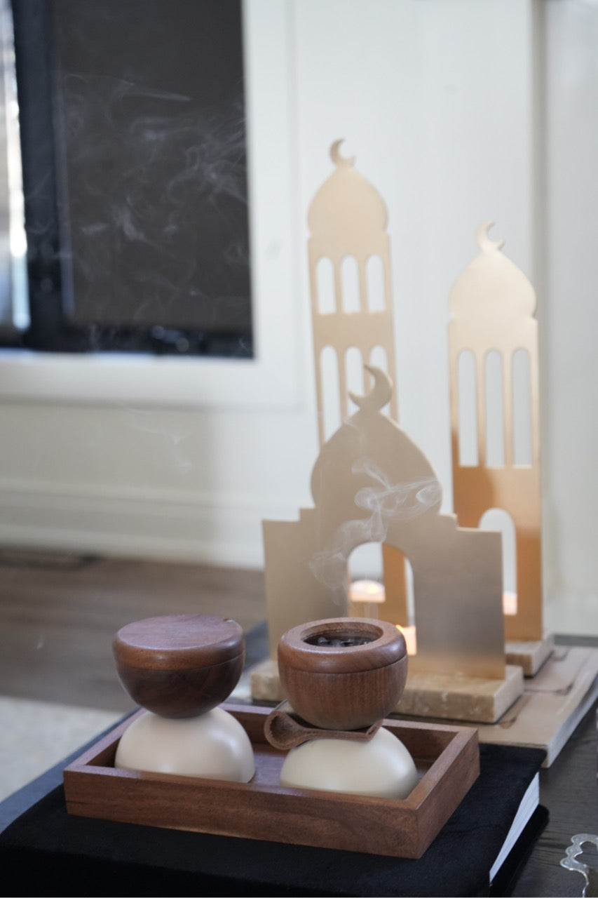 The set includes a bukhoor holder, burner, and tray, making it both functional and beautifully styled.