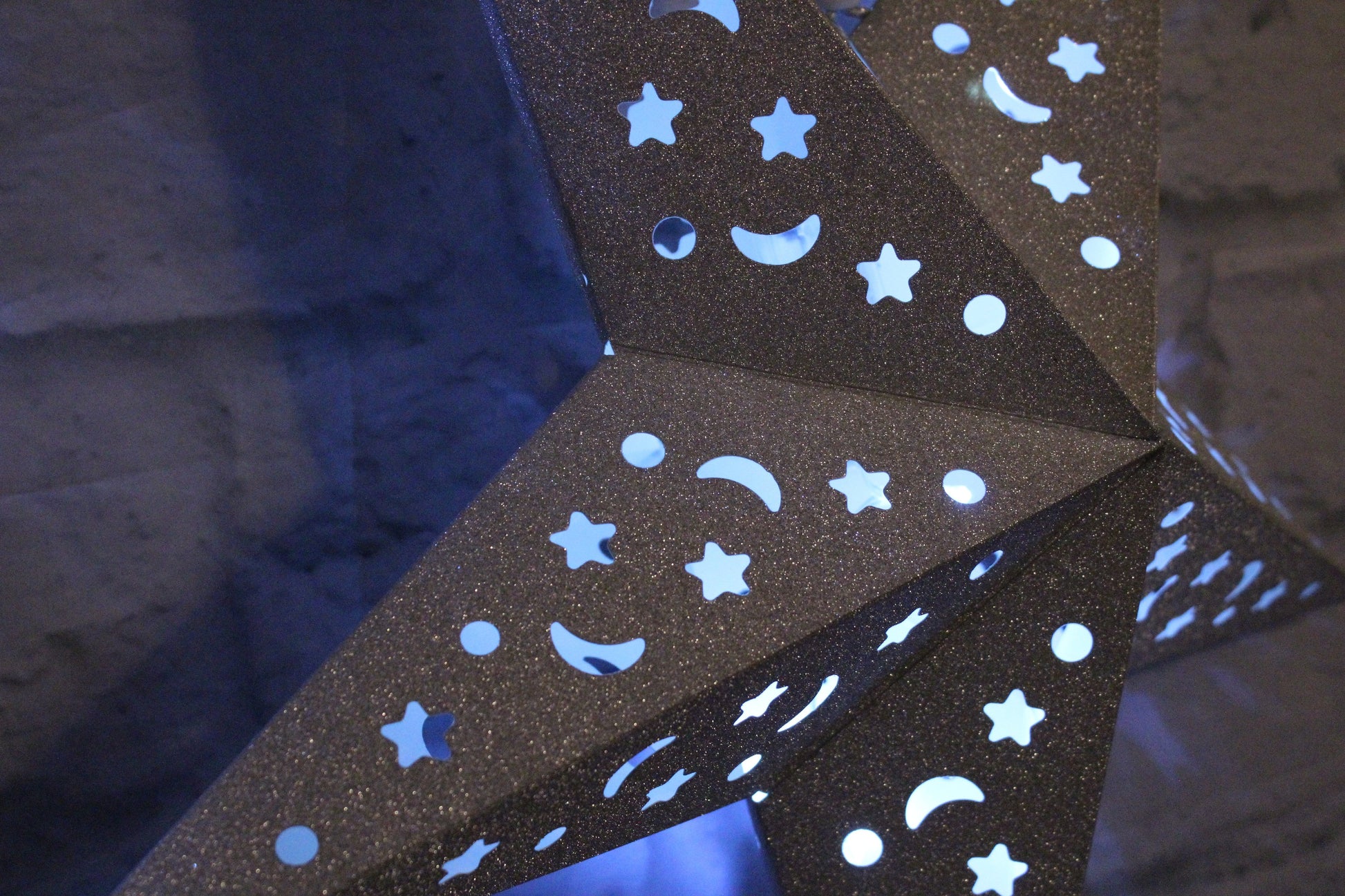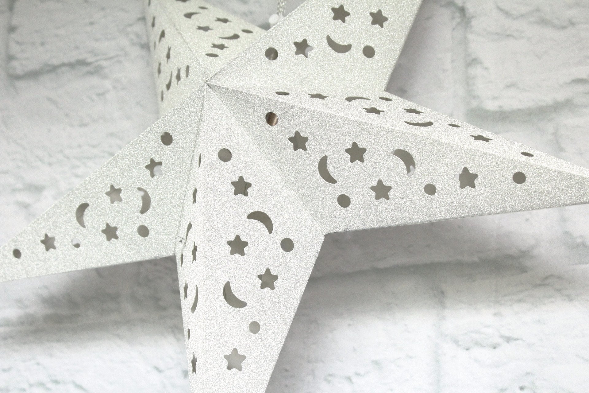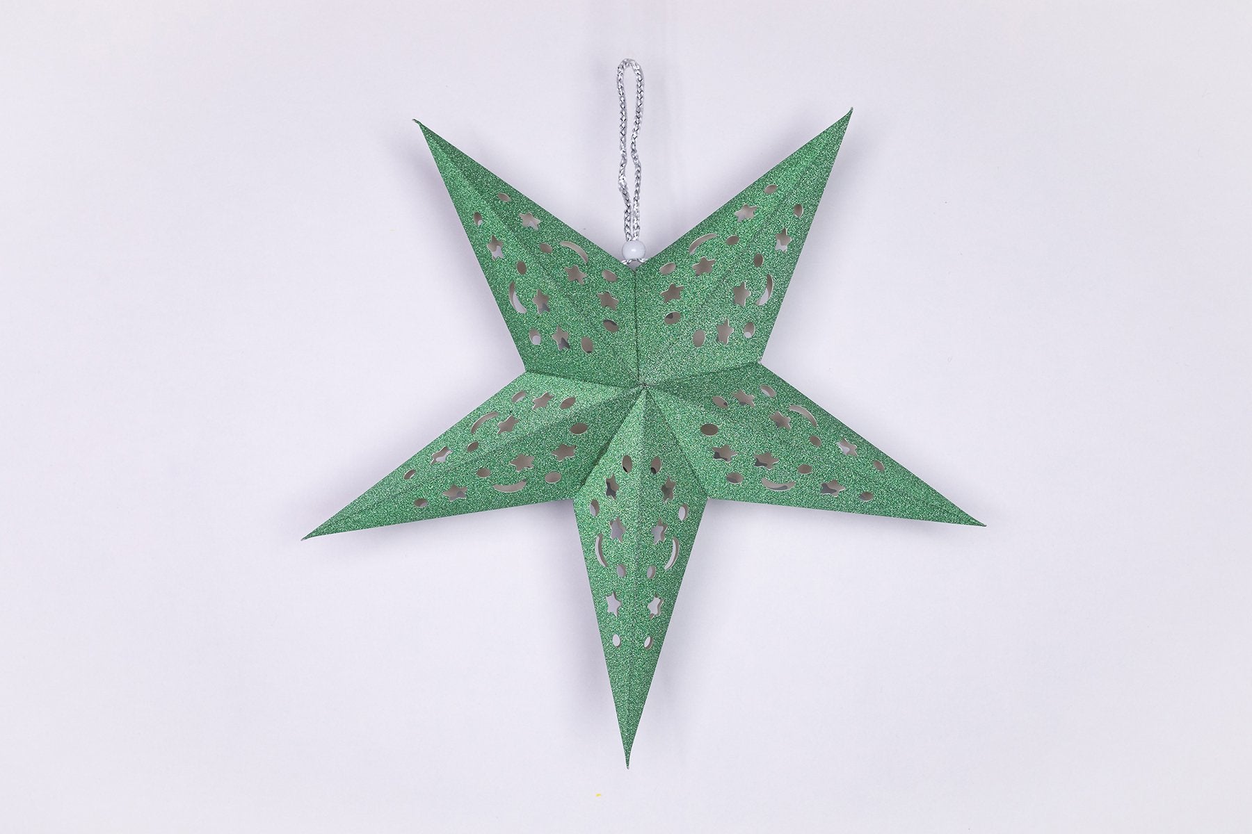 These are our new and improved Days of Eid™ Paper star lanterns. We classied up our colors & textures to give you the ultimate Eid experience. During the day, these star lanterns shimmer and at night the star and moon cutouts create beautiful shadows all over your walls. These are the green glitter colored lanterns.